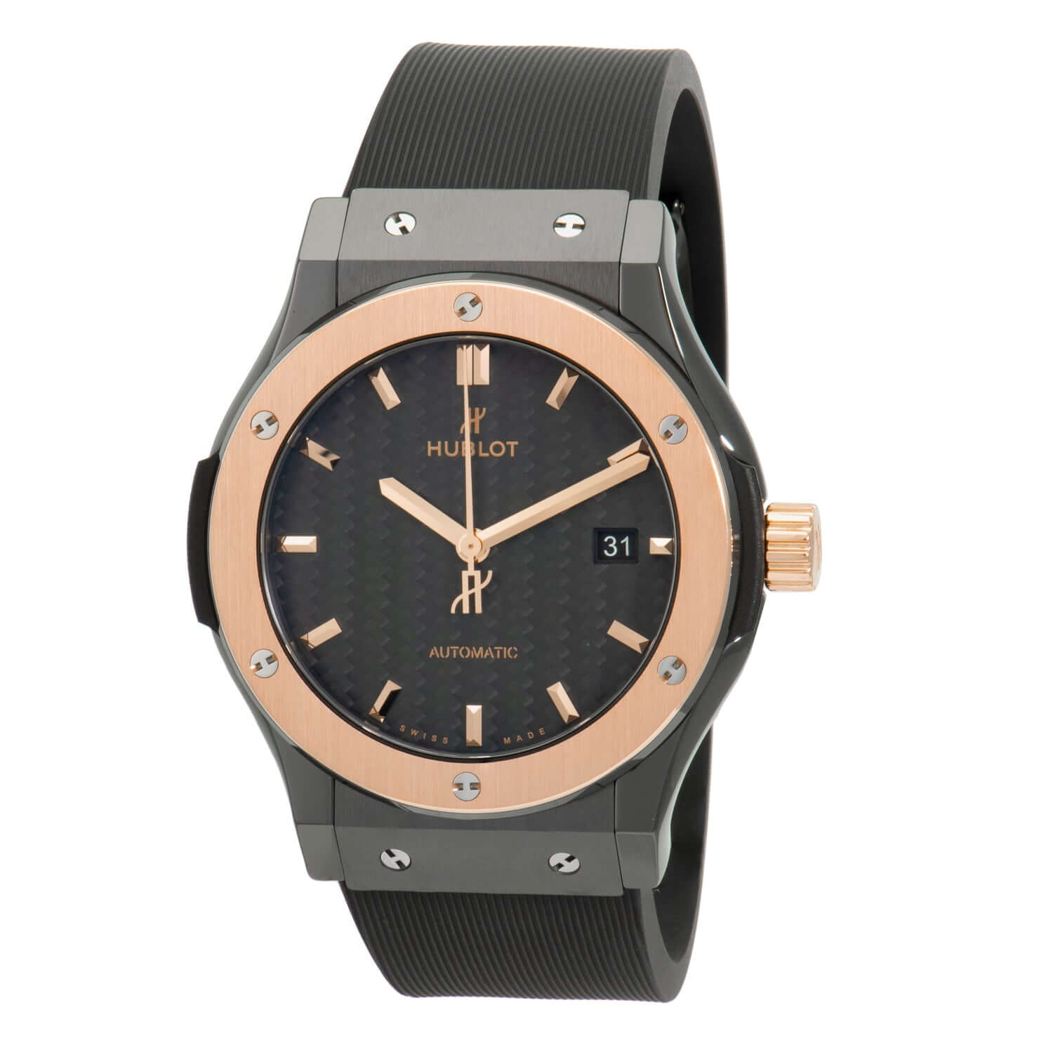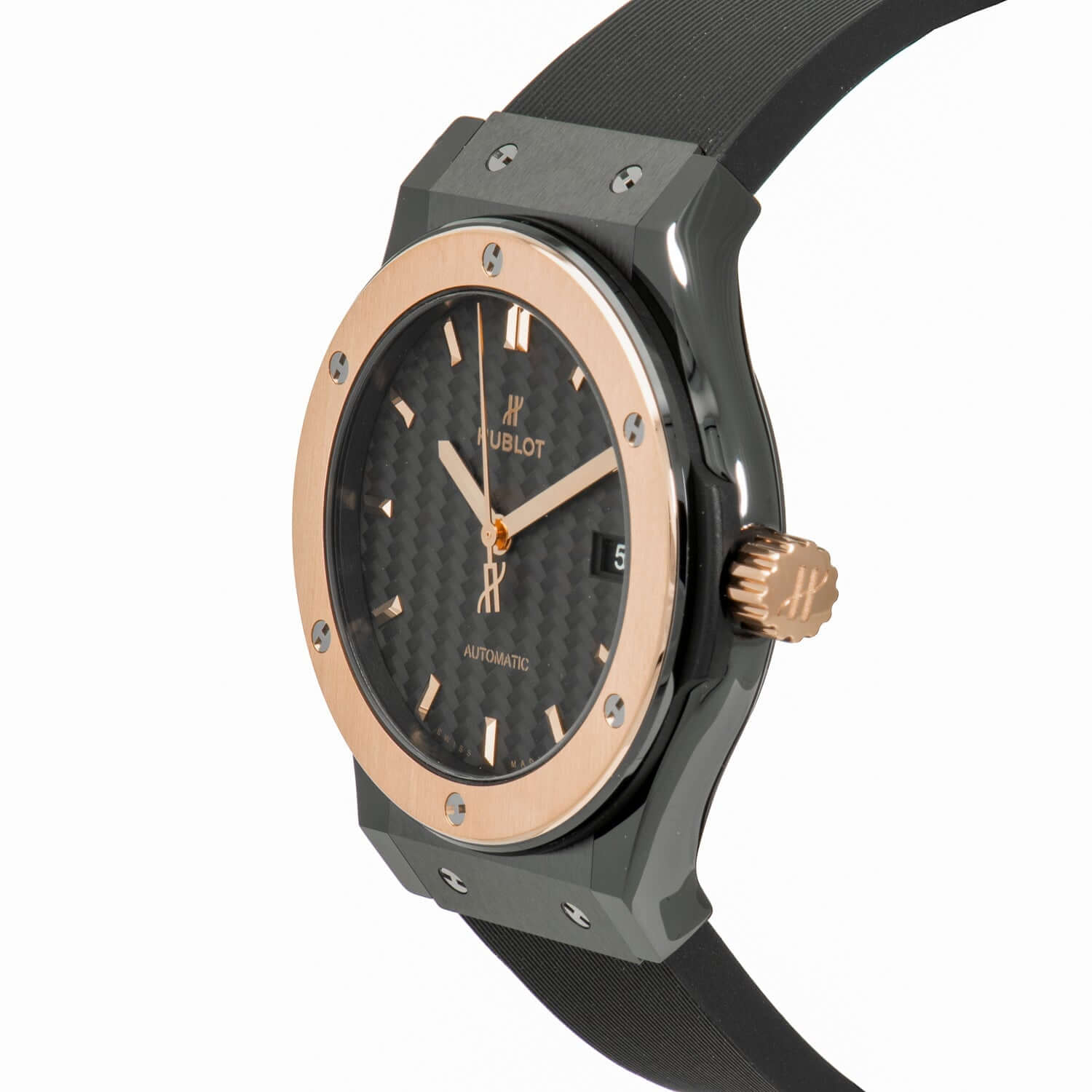 - Crown: Solid polished 18kt rose gold with Hublot logo engraving.